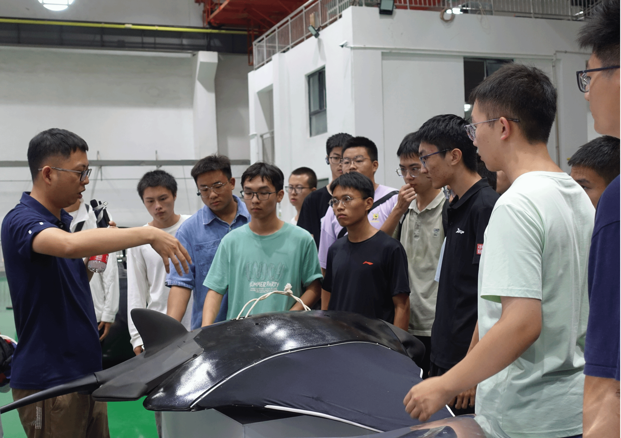 随后,围绕实验室的设备设施和产品两方面展开学习和参观。设备设施方面,叶老师以深海中“压力”和“通信”两大问题引入,带领学生先后参观高压釜试验系统和水下发射系统试验平台,对其工作原理作了深入浅出地介绍。产品方面,为学生展示并科普实验室研制的无人自主水下航行器、新型水下滑翔机、仿生柔体潜水器等性能先进的水下无人装备。以上产品均以各自优越性见长,为海洋工程装备跨越式发展,为无人水下运载技术的发展以及学校学院“双一流”建设做出了突出贡献。