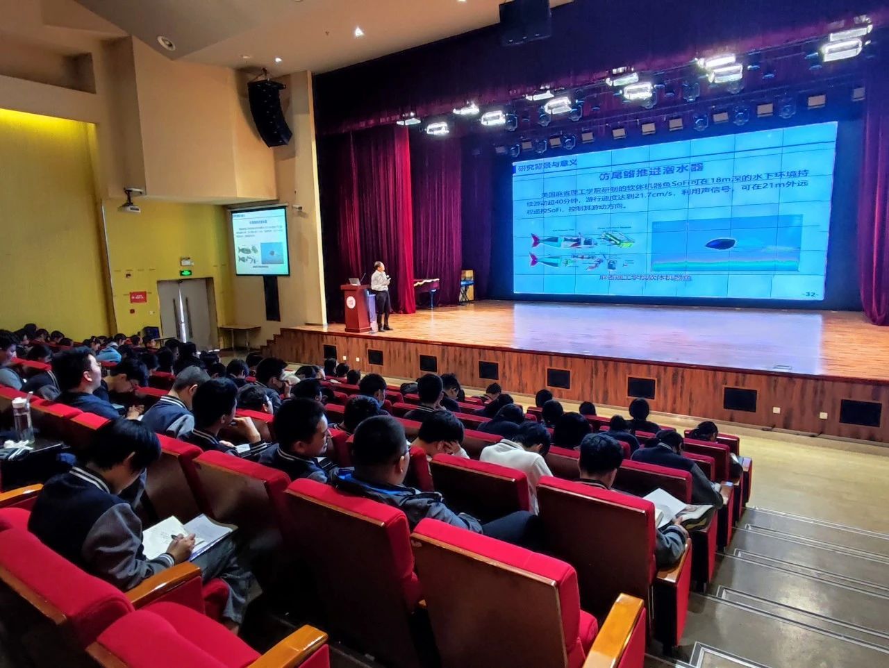 院长潘光教授走进复旦附中青浦分校,为200多名高中生做了题为《仿蝠鲼柔体潜水器研制》的科普讲座。讲座内容丰富、深入浅出,赢得了阵阵掌声,为同学们种下了海洋科学的种子。