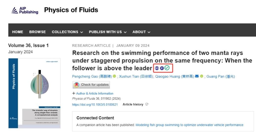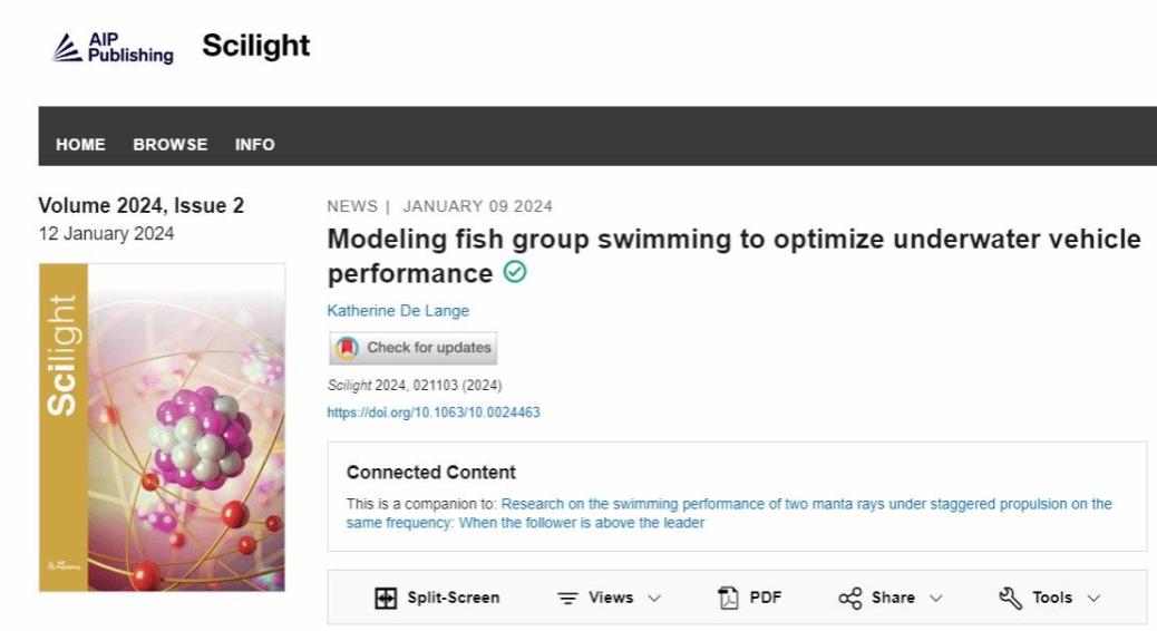 潘光教授团队发表题为“Research on the swimming performance of two manta rays under staggered propulsion on the same frequency: when the follower is above the leader”的研究论文。该研究成果被国际流体力学知名期刊《Physics of Fluids》作为主编推荐特色文章(Featured Articles)发表(图一),并被美国物理学联合会“科学之光”(Scilight)专题文章采访报道(图二)。动画a片
