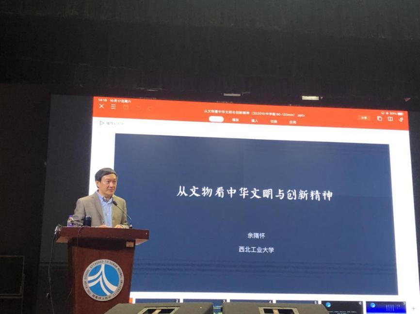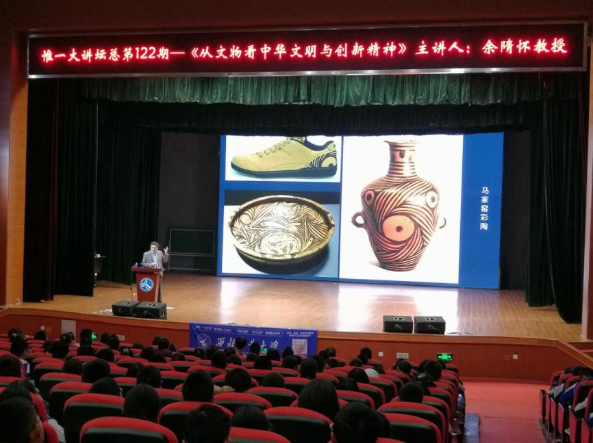 机电学院余隋怀教授做客湖南师大附中惟一大讲坛,为全体高一学生做了题为《从文物看中华文明和创新精神》的讲座。余老师带领潇湘学子穿越中华千年文明,从文物中品味中华文化盛宴。从仰韶时期马家窑彩陶的奇妙漩涡,到殷商、西周时期甲骨文、金文的“师法自然”,再到四合院等古代建筑的“天人合一”;从秦代制与器的威严、强盛,到汉代造物的“以人为本”,再到盛唐的开放与繁荣,余教授带领大家在中华历史的长河中穿梭,用大量的史料与文物展示了中华文明与器物的瑰丽与震撼。五星出东方,为开来而继往。“我们比历史上任何一个时期都更接近中华民族的伟大复兴。”余隋怀勉励学子勇接时代火炬,在批判中继承,在继承中发展,尽己之力点燃文化之火,肩负起时代使命,做有素质、会创新、傲立于世界文化之巅的新青年。“只有唤醒古老中国蕴藏的能量,在现代语境下复苏,才能带动起整个东方文明。我们要呈现于世的不是甜品,而是盛宴。”