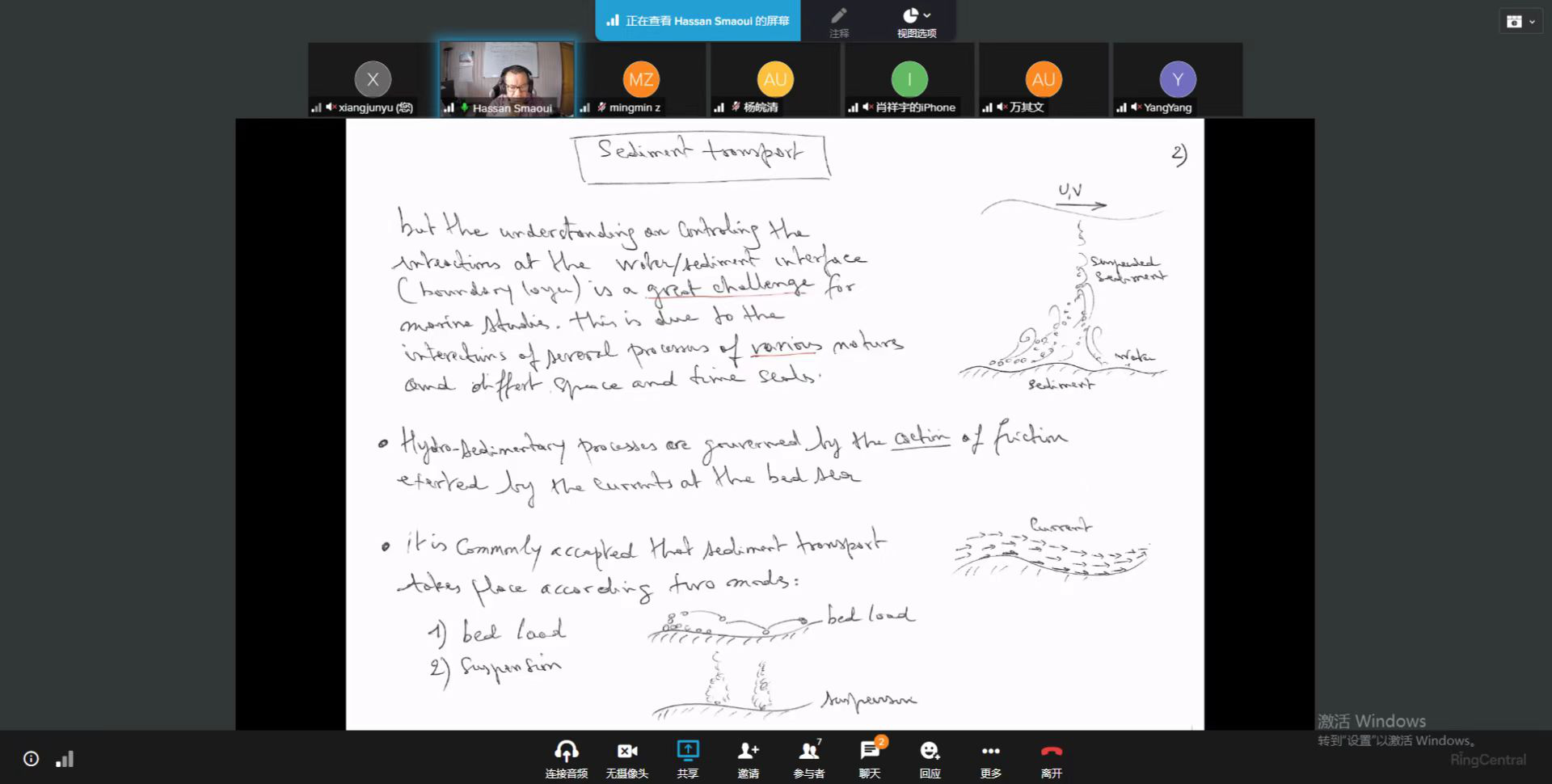 Hassan Smaoui研究员首先对本门课程的大纲及相关安排进行了介绍,并为大家讲解了海洋系统在全球生态环境中的重要性。然后带领大家建立相应的浅水方程(SWE),讨论湍流及其相关的建模问题,并对湍流底部边界层及其在混合过程中的作用进行了深入的讲解。接着讲授了海洋环境中泥沙运输的不同机制和模式,带领同学们对泥沙流管理不善所带来的问题(淤积在海洋结构物底部,尤其是港口基础设施)进行了深入探讨,并建立了不同的数学模型用于估算相应的泥沙通量。最后Hassan Smaoui研究员为大家讲解了研究浅水方程离散化的不同方法,并着重为大家讲授了有限体积法以应对海岸流及其相关过程的近似科学