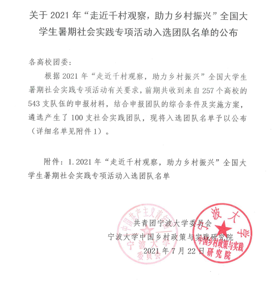 “苹”凡之力扶贫助农实践队成功入选宁波大学团委、宁波大学中国乡村政策与实践研究院组织的2021年“走近千村观察,助力乡村振兴”全国大学生暑期社会实践专项活动。据了解,前期主办方共收到来自257所高校的543支队伍申报材料。结合申报团队综合条件及实施方案,遴选产生了100支社会实践团队。