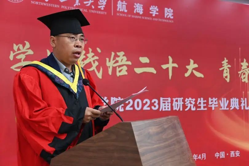 “士不可以不弘毅,任重而道远”“路漫漫其修远兮,吾将上下而求索”。典礼进行第七项,潘光院长致辞。潘光回顾了学院近年来取得的辉煌成就,见证了2023届研究生在校期间经历的大事件,肯定了海院学子的责任与担当。同时潘光寄语毕业生要心怀“国之大者”,立家国天下之志;要坚定矢志奋斗,明永不言弃之理;要担当时代之责,成顶天立地大事。最后,祝毕业生们都能实现更高的成就与价值,常回家看看,祝大家毕业快乐、前程似锦。