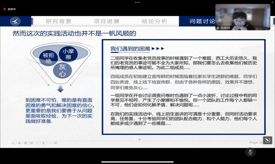2024 年1月30日,在前期材料整理、目标学生宣传的基础上,实践队进行了线上招生宣讲。实践队同学分别向参与者介绍了西工大优势、西工大老党员故事和高三复习方法等内容。这次活动加强了实践队同学们高中母校学生及家长对西北工业大学的了解,在高中同学们心中埋下了未来投身国防建设的种子,也锻炼了团队成员的语言表达能力。