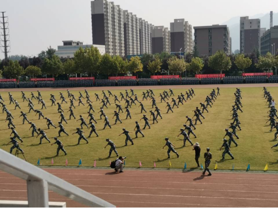 在云天苑操场上,新生们准备接受校领导和师长的检阅。威武的解放军进行曲结束后,汇演正式开始,每一位同学都拿出了最好的精神风貌迎接检阅。