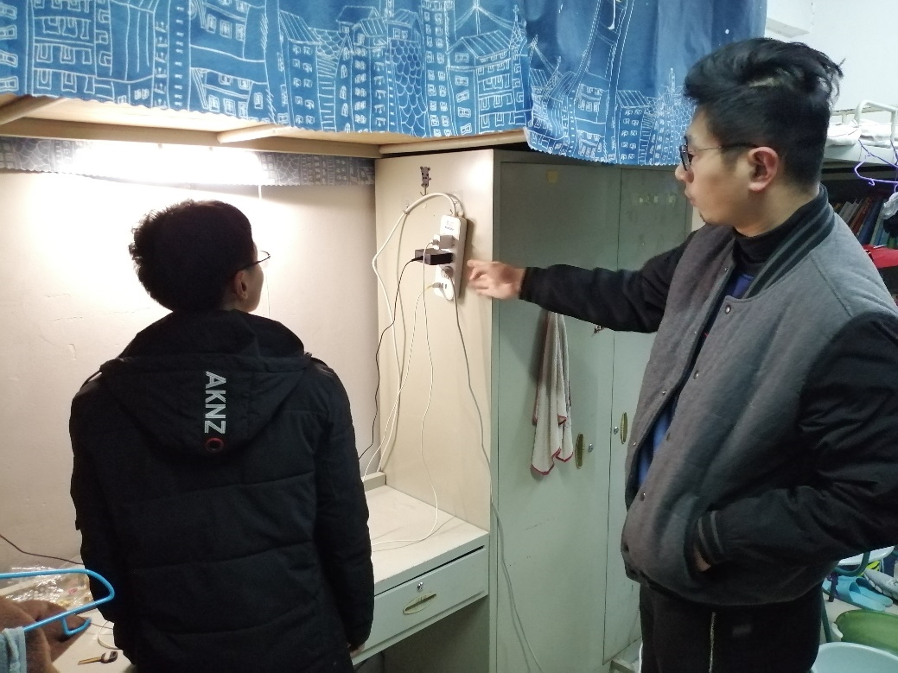 院长助理张龙与17级本科生辅导员杜鹏、研究生辅导员廉杰一起来到旺园学生宿舍,对学生宿舍安全进行了专项检查,重点检查用电安全及防火安全的情况,并与学生亲切交谈,重点交流宿舍卫生、考试情况、离校安排、考研经验等方面的问题,在寒冬为学生带来院方的新年温暖。