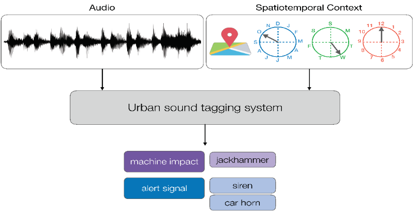 基于时空语境的城市声音标注任务是在包含音频以及录音时间地点的条件下,在10秒的声音中检测噪声污染源是否存在,这些噪声污染源分为8个粗类,23个细类别,例如引擎声、机械/非机械冲击声、电锯声、警报声、音乐声、人声等。这项任务的动机是建立机器监听工具的现实问题,以协助监测、分析和减轻城市噪音污染。
