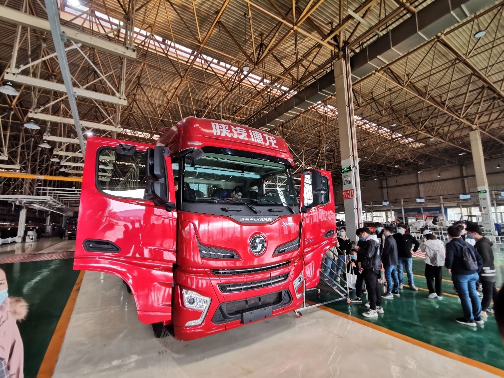 随后,师生共同参观了陕汽重型卡车的总装车间,流水线的工作形式,干净整洁的工作环境让工人能够高效的完成工作。登上已组装的展示用重卡,和老一代车型相比,拥有更为简洁的仪表盘,自动挡位及更宽敞的双人卧铺,使新一代重卡的驾驶环境舒适的多。陕汽的成功,除了企业管理、科技创新,同样来源于对客户体验细致入微的考虑及关怀。