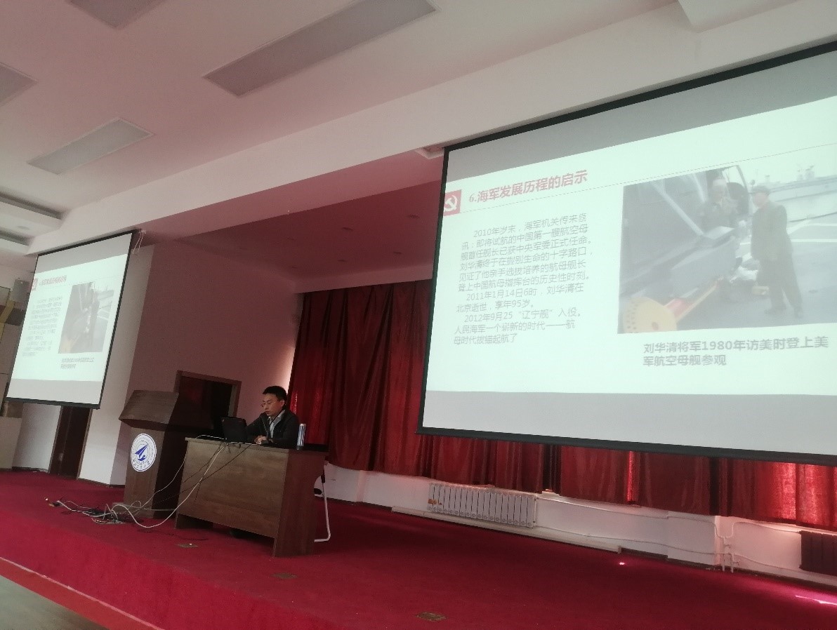 刘静从人民海军、航空母舰、核潜艇、鱼雷几个方面介绍了我国海军的发展历程,讲解了我国海军从诞生时的艰苦奋斗到建设海洋强国的中国特色社会主义新时代,激励同志们励志深蓝,向海图强,为国防事业奋斗。