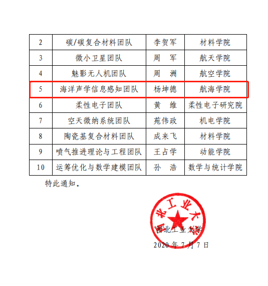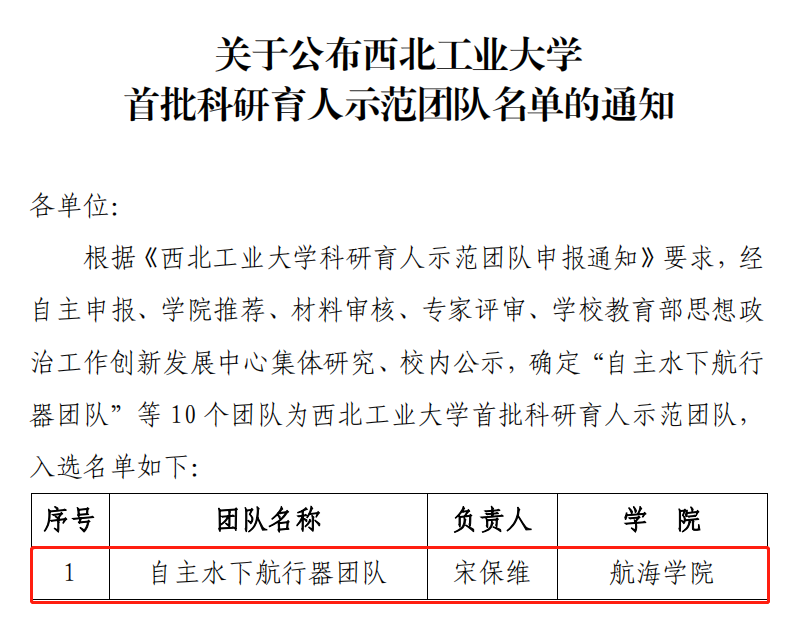 根据《西北工业大学科研育人示范团队申报通知》要求,经过审核研究,校内公示确定10个团队为西北工业大学首批科研育人示范团队。我院自主水下航行器团队、海洋声学信息感知团队入选。