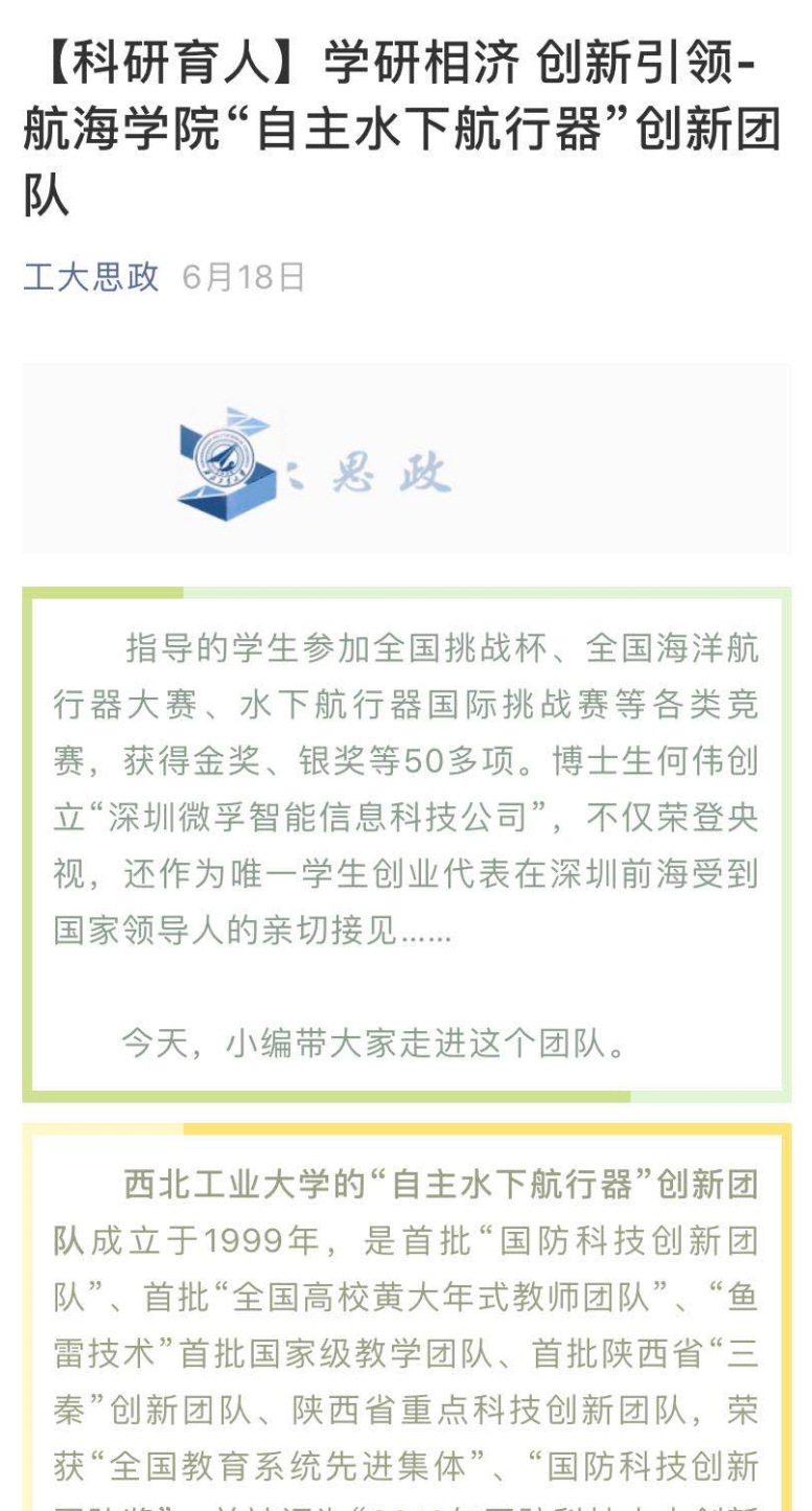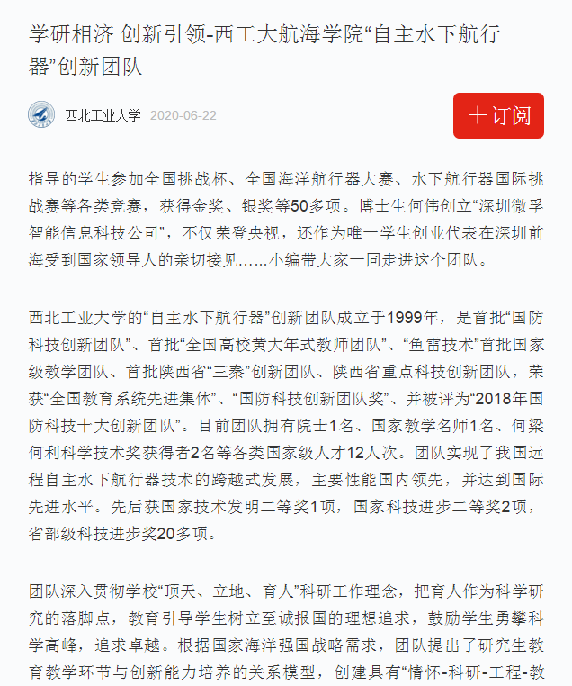 西北工业大学“自主水下航行器”创新团队成立于1999年,长期从事新型水中兵器、水下航行器基础理论和核心技术攻关、工程型号研制以及人才培养工作。该团队是首批“国防科技创新团队”、首批“全国高校黄大年式教师团队”、“鱼雷技术”首批国家级教学团队、首批陕西省“三秦”创新团队、陕西省重点科技创新团队,荣获“全国教育系统先进集体”、“国防科技创新团队奖”、并被评为“2018年国防科技十大创新团队”。
